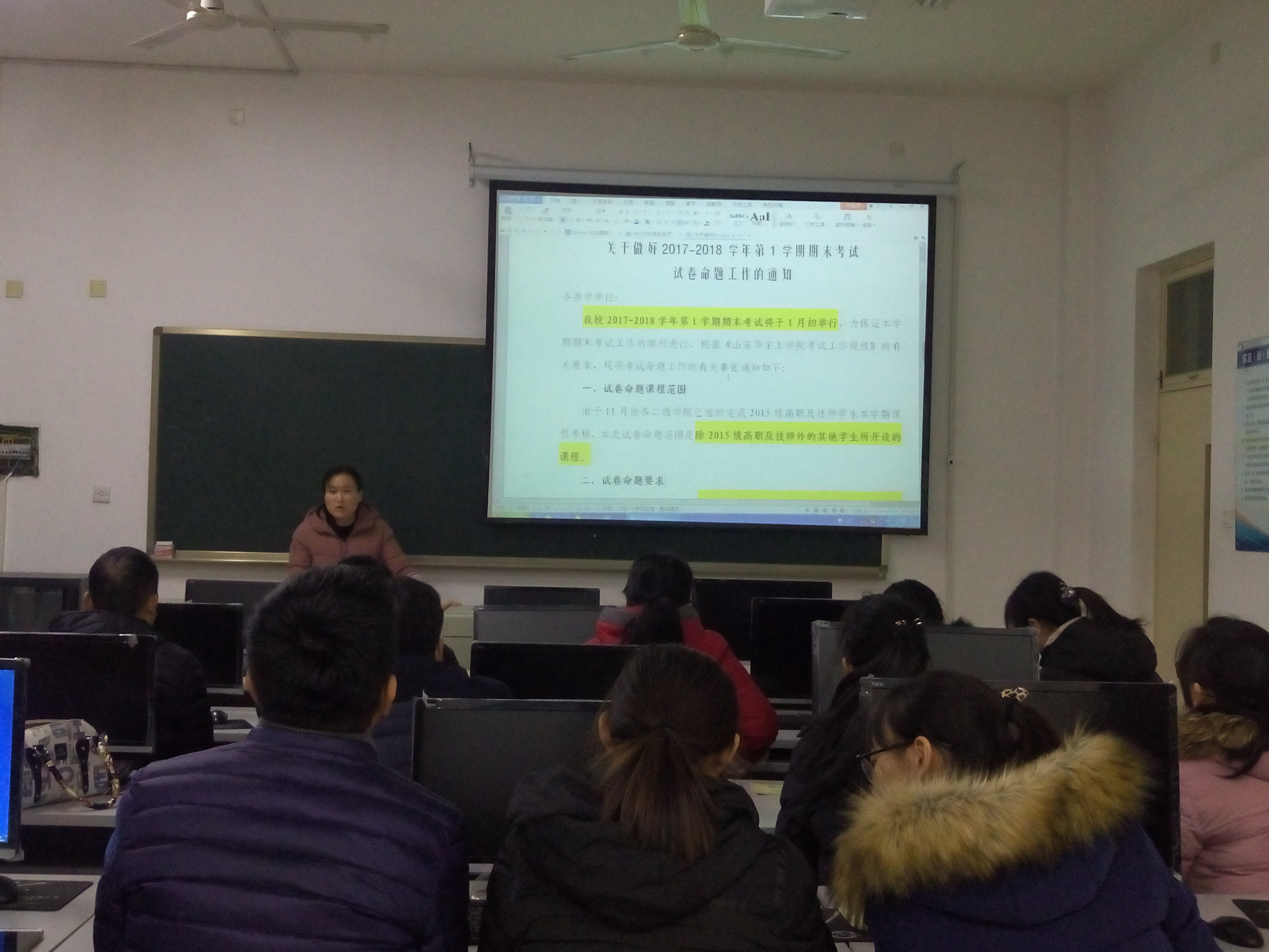 会议开始,王燕科长强调了召开此次期末考试命题专项会议的重要意义,要求全院教师以本科学士学位合格评估指标为指引,以教务处的相关规定为依据,认真做好2017-2018学年第1学期期末考试试卷命题工作。随后,又对本学期期末考试命题工作做了详细的说明,并就保密工作、命题原则、命题工作的组织和具体要求等作了重点说明。最后再次向各位老师强调试卷命题中的各项注意事项: 一是考试命题以课程教学大纲为依据,每套试题应涉及课程教学大纲要求掌握的主要知识点,考试重点应与课程教学大纲确定的学习重点相一致;二是题型选择应力求多样化,不同课程可结合本门课程特点并参考行业职业资格考试发展选择合适的题型,每套试题题型一般应不少于5种;三是试卷名称必须与专业人才培养方案课程名称一致,试题中的各种符号、图形、表格等规范清晰;四是试题难易要适中,有一定区分度,能够全面测量员工掌握知识的程度和实务操作能力;五是坚持命题自测制度,通过自测试卷检查试题内容与课程教学大纲学习重点内容是否相符,试卷格式是否符合要求,试题题量及难易度是否符合要求等。