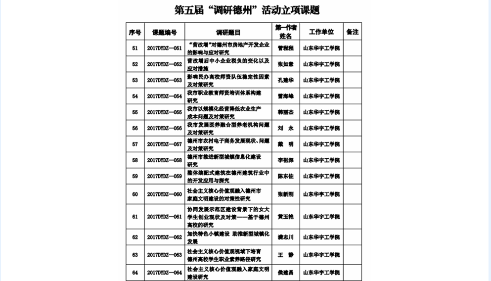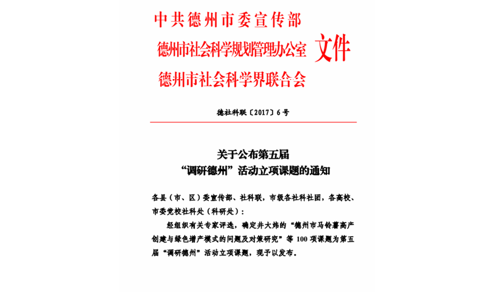 近日,中共德州市委宣传部、德州市社会科学规划管理办公室和德州市社会科学界联合会联合下发《关于公布第五届“调研德州”活动立项课题的通知》(德社科联[2017]6号)文件,公司辅导员满志川《加快特色小镇建设 助推新型城镇化发展》项目获批立项,实现公司员工工作队伍科研工作“零”突破,填补了课题申报领域的空白。