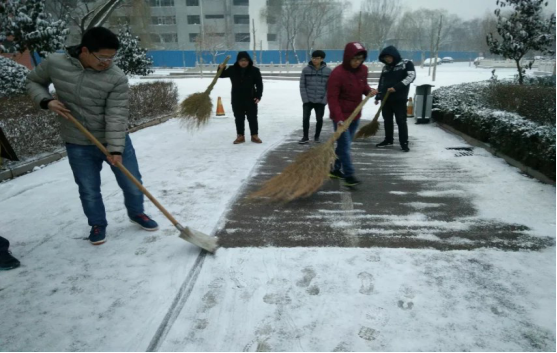 次日清晨6点30分,全体员工会干部及干事早早在楼下集合,气温虽低至零下,但同学们个个热情高涨,整装待发,拿好工具准备进行扫雪工作。在老师和员工会干部的指挥下,浩浩荡荡的扫雪队伍便开展起来。尽管严寒的天气使得每一位成员双脸通红,手脚麻木,但是并没有阻挡了他们扫雪的步伐。他们严格遵循“团结协作,各司其职”这一原则,积极进行着扫雪活动。最终,在大家的协调努力之下,被白雪掩埋的沥青路重见天日,为大家的辛苦劳作画上了完美的句号。