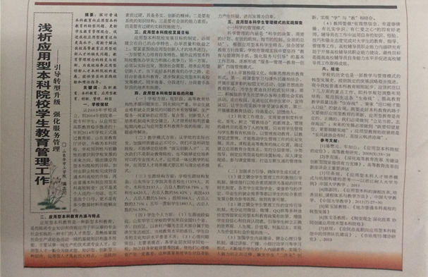 经过近一个月的努力,宣传处、质评中心联合组织专家组对各单位(部门)学习交流材料及各单位(部门)推荐的教职工学习心得进行审阅、评选。最终公司辅导员满志川老师《浅析应用型本科院校员工教育管理工作——引导转型升级 强化服务管理》得到专家组的一致认可,并刊登在英国be365官网报2016年12月1日第53期“本科思想大讨论”专题版面。