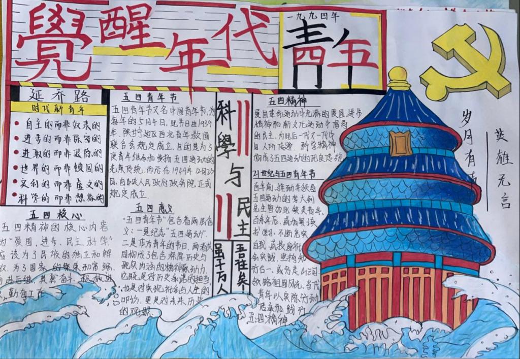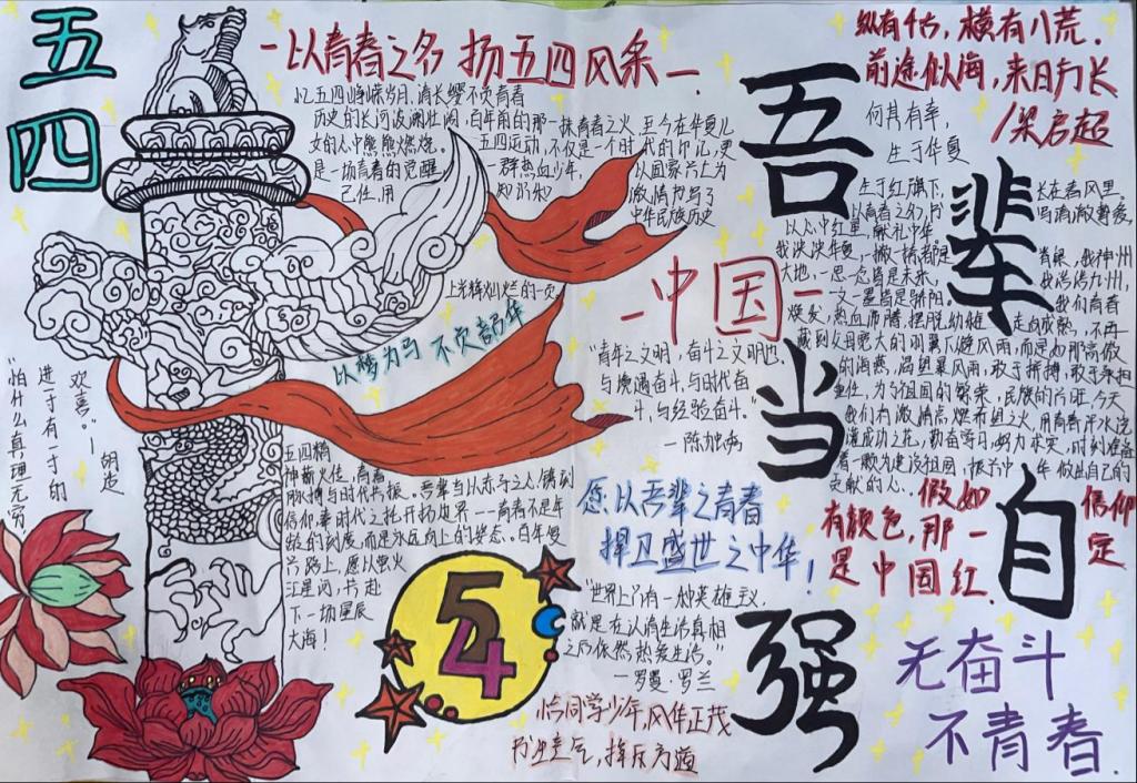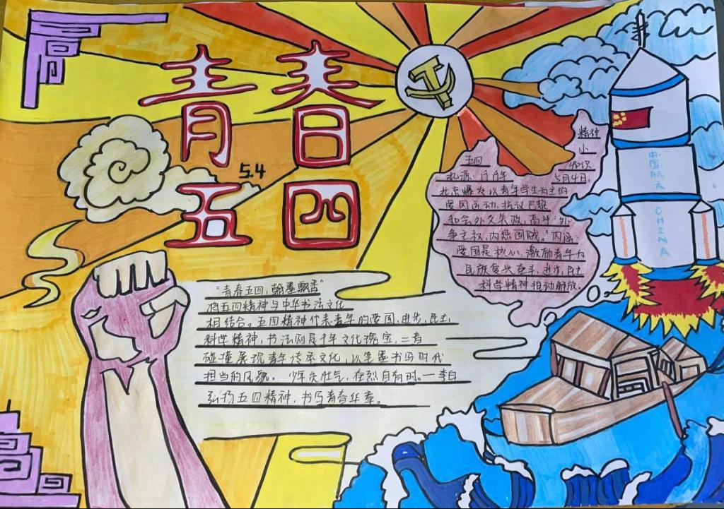 活动以“五四精神与书法传承”“青年风采与笔墨寄情” 为创作主线,同学们利用课余时光,深入挖掘历史资料,钻研书法艺术,将五四运动的精神内核与书法艺术的独特魅力完美融合。在创作过程中,他们精心构思版面,认真书写工整美观的文字,搭配灵动插画与凝练语句,生动诠释了新时代青年对五四精神的深刻领悟与传承信念。有的同学以行楷书写《少年中国说》,字里行间彰显青年担当,有的以水墨丹青重现五四历史场景。同学们将传统书法与现代插画巧妙结合,生动展现当代青年的奋进姿态。