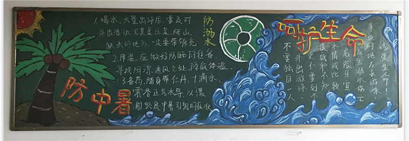 各班级积极绘制黑板报,设计新颖独特,画面灵动,色彩丰富,体现出各班级对本次防溺水防中暑黑板报的重视,本次黑板报制作使同学认识到在日常生活中防患于未然的重要性和生命的脆弱和可贵,及时地为同学们敲醒了安全的警钟。
