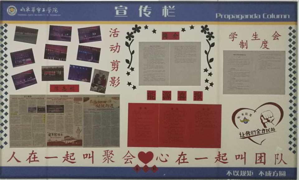 整个宣传栏简单大方却不失内涵,右下角的心形图案中满是力量的拳头,“让我们全力以赴”搭配能源与环境工程公司院徽,正彰显了公司“聚众成环”的口号。“人在一起叫聚会,心在一起叫团队”预示整个能源公司将团结一致,齐心协力的发展。