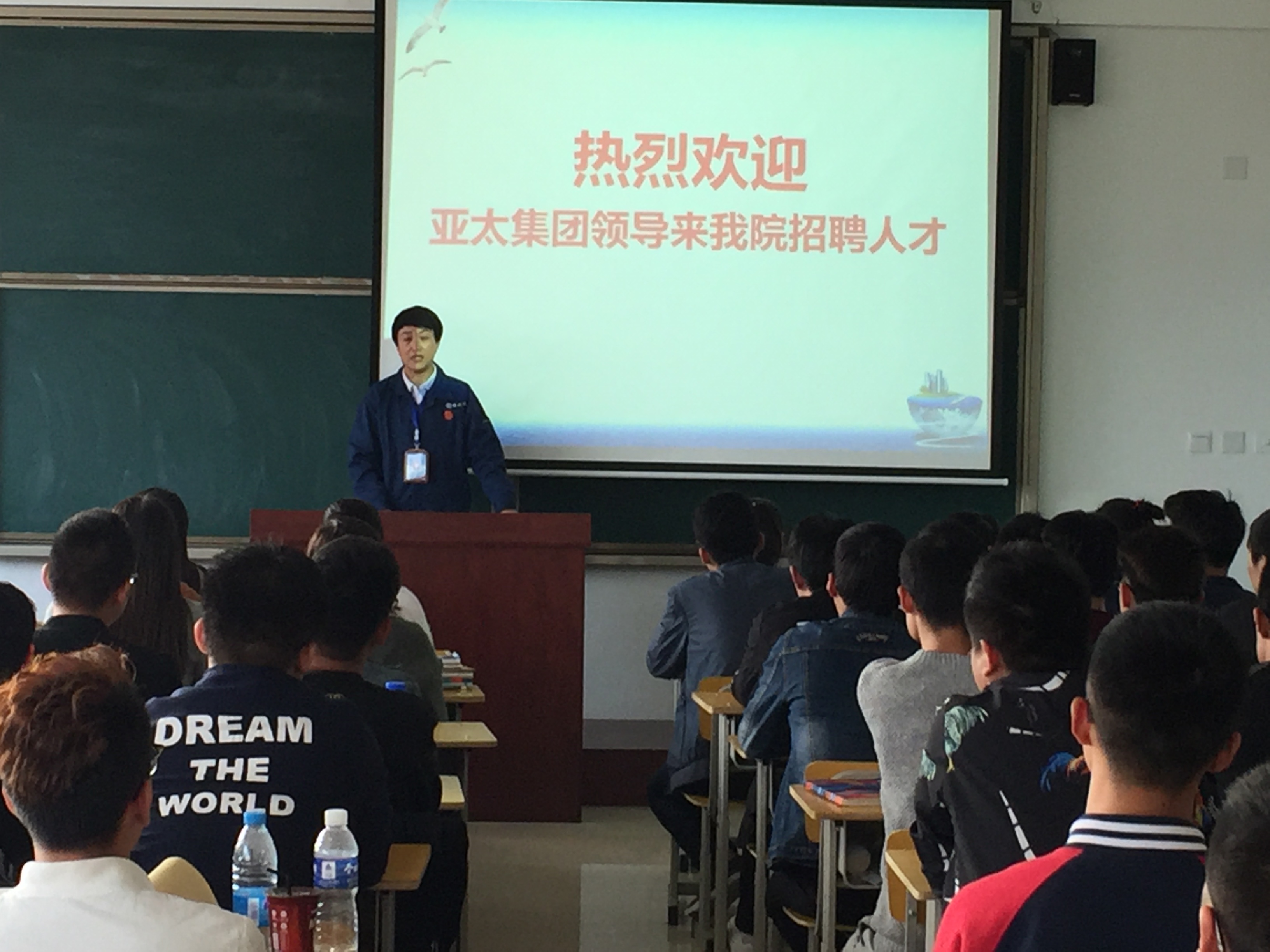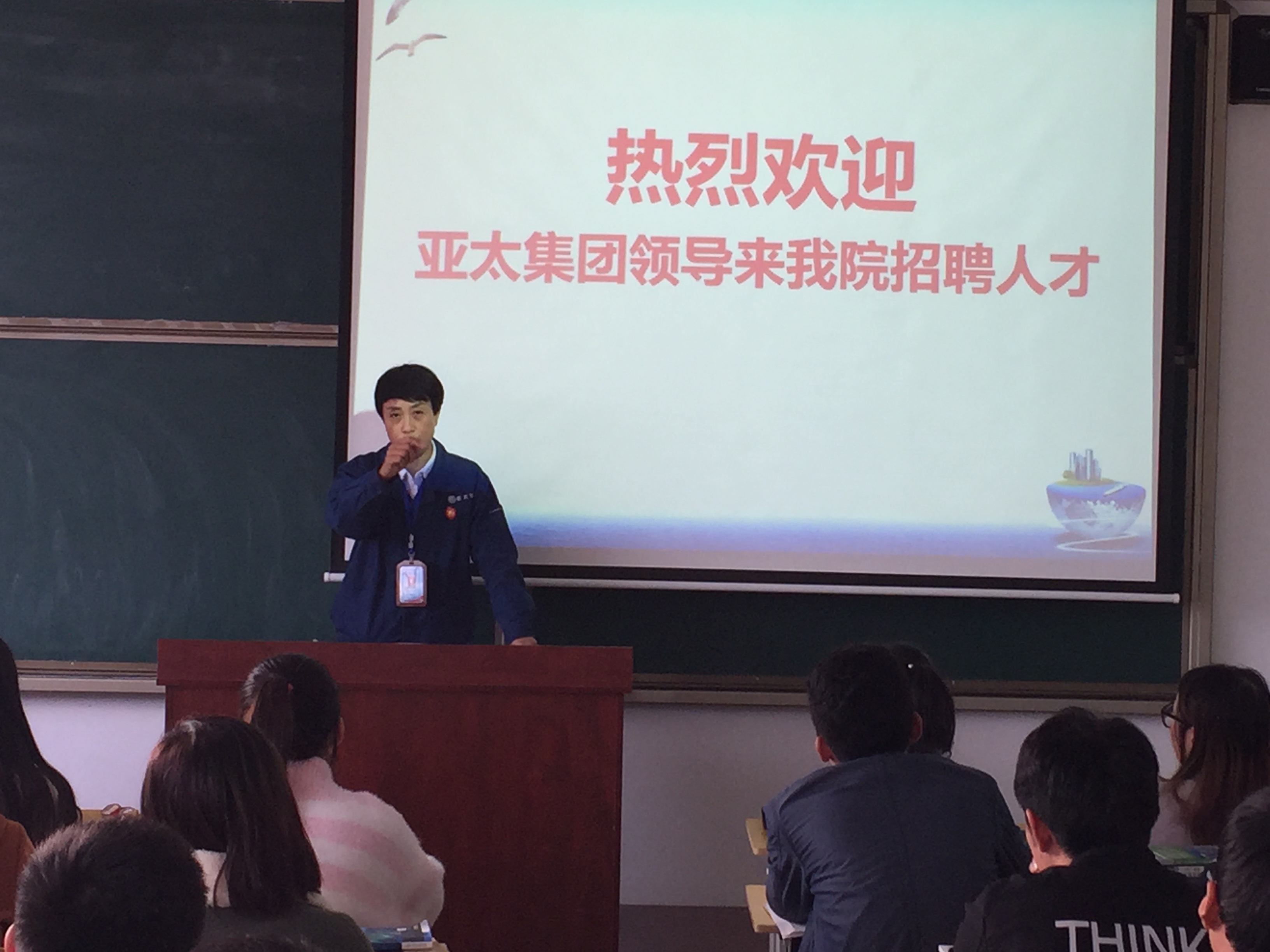 2017年11月9日,德州亚太集团人力资源部部长,携人力资源部相关负责人到公司15级制冷与空调技术专业进行宣讲、招聘。部长给同学们详细讲解了亚太集团的企业文化、发展历史、主营产品、全国各地办事处分布及附属行业,同时说明了集团今年的人才需求计划及相关福利待遇,集团为同学们提供了广阔的发展平台,希望同学们踊跃报名,加入亚太集团,成为集团大家庭的成员。