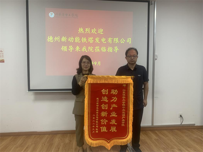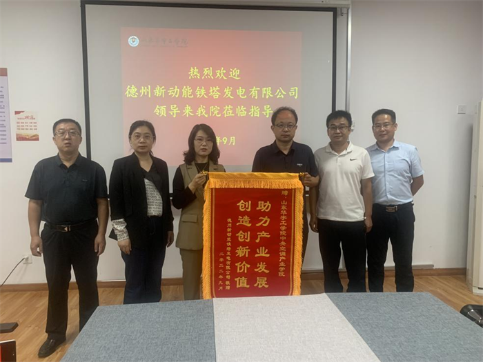 德州新动能铁塔发电有限公司张清哲总经理对公司的文化建设、公司的专业建设等方面给予了高度的赞誉,同时对公司的发展历程、主要经营范围、公司规模做了详细介绍。张总表示,在企业扩大经营范围、增加产品系列的关键时期,公司选派袁家普教授、王雅静两位深入一线,为企业技术人员提供了专业的技术培训,大大鼓舞了公司技术团队保留优势项目,实现全面发展的信心和决心,特地送锦旗表示感谢;同时,表达了希望通过“共建实践基地、共享人力资源、共育科技成果”等方式,校企联合培养行业急需人才、助力产业发展的期许。