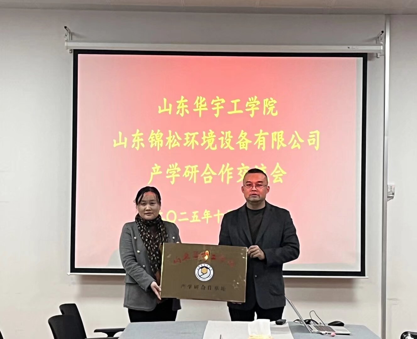 交流会上,魏校助将公司的团队队伍建设、教学条件、人才培养、员工实习、就业等方面进行了详细的介绍。企业总经理王文海详细阐述了行业发展痛点与技术需求,提出在智能环保设备研发、空气源热泵工程实践等方面的合作诉求。双方围绕共建联合实验室、开展技术攻关、共建实习基地等议题深入研讨,达成多项合作共识,并举行了产学研合作基地授牌仪式。