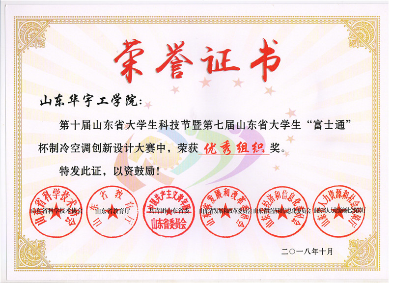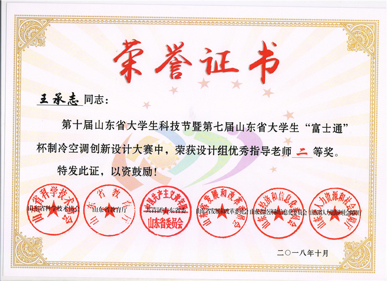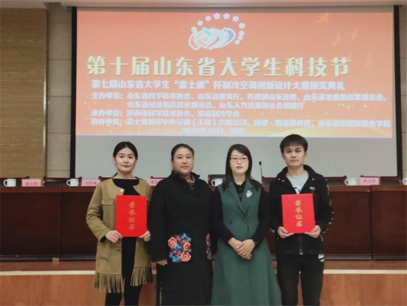 第十届山东省老员工科技节暨第七届山东省老员工“富士通将军”杯制冷空调创新设计大赛颁奖典礼于山东城市建设职业公司图书馆报告厅隆重举行。能源与环境工程公司员工的参赛作品在大赛中获得二等奖1项,三等奖2项,优秀奖若干项的优异成绩。魏丰君、王燕、相培等老师获得优秀指导教师奖。同时,公司因参与大赛积极性高,作品质量整体较好,被大赛组委会授予优秀组织奖。公司的2018届毕业生王宗伟、单宝琦两位同学考入了山东建筑大学研究生,这次代表建筑大学参赛并获奖,与公司2015级建环专业参赛员工王梦瑶、宋玉坤同台领奖,成为颁奖典礼现场的一个亮点。