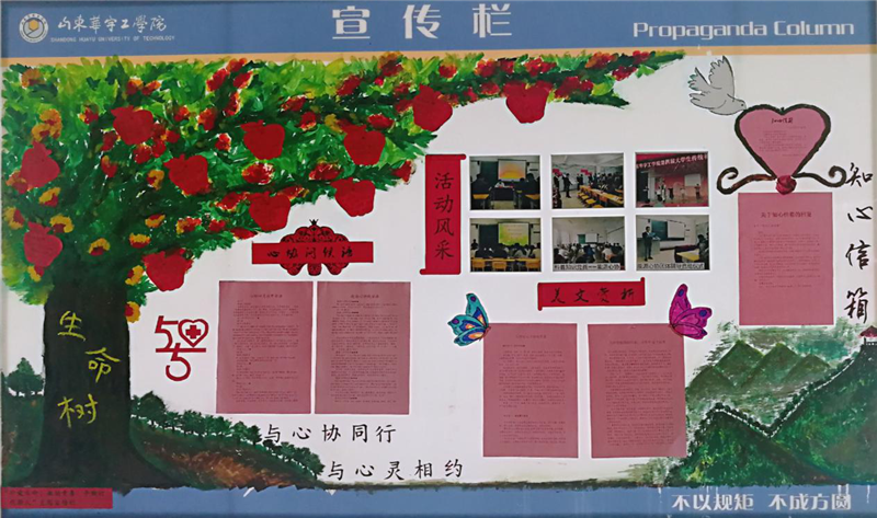 本期心理宣传栏的制作围绕“珍爱生命,激扬青春,争做时代新人”为主题,共分5个版块。其中,画面中的“生命树”——苹果树,作为宣传栏的亮点,象征着公司的盎然生机活力,寓意在众位学子的共同努力下,公司取得的丰硕成果与佳绩。