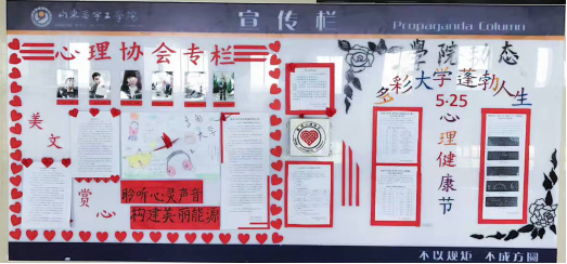 5月4日,能源与环境工程公司心理协会便开始了“多彩大学 蓬勃人生”为主题的宣传栏筹备工作,由实践部长杨豪东主要负责,在心理协会全体成员的共同努力下,对宣传栏的色彩、排版、文字和图案等多个方面进行了规划和制作。我们力求主题突出、设计新颖、布局合理、图文并茂、书写工整,我们力求美丽与内涵同在、速度与质量兼得。宣传栏整体分为两大板面,左边为心理协会专栏,会员们运用自己所学精心制作心形剪纸装饰宣传栏四周,宣传栏上方张贴了会长和各部长的照片,位于中心的是本次活动的主题海报,其上点缀几只纸鹤,不乏生机与活力。其左侧是挑选出的员工来稿美文,其正下方用红纸醒目地张贴了公司心协的标语:“聆听心灵声音,构建美丽能源”。整个宣传栏中间位置为我们公司特色的知心信箱,也张贴了对来信者的悉心解答。右边为公司动态,紧跟这次主题活动,精心剪出“多彩大学蓬勃人生”和“525心理健康节”几个彩色字,并张贴了为响应公司举办的老员工心理健康节系列活动之公司进行初选的结果。
