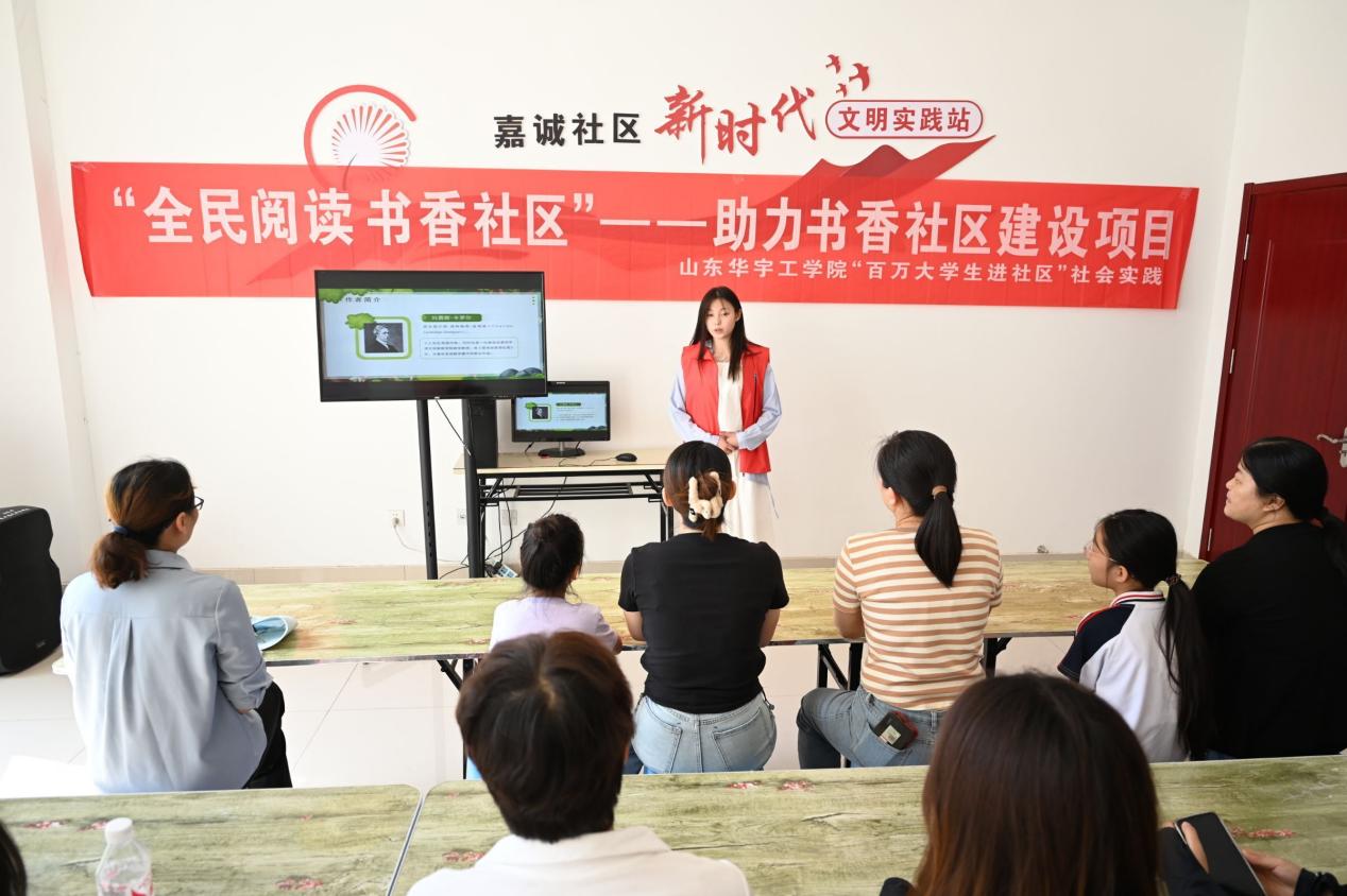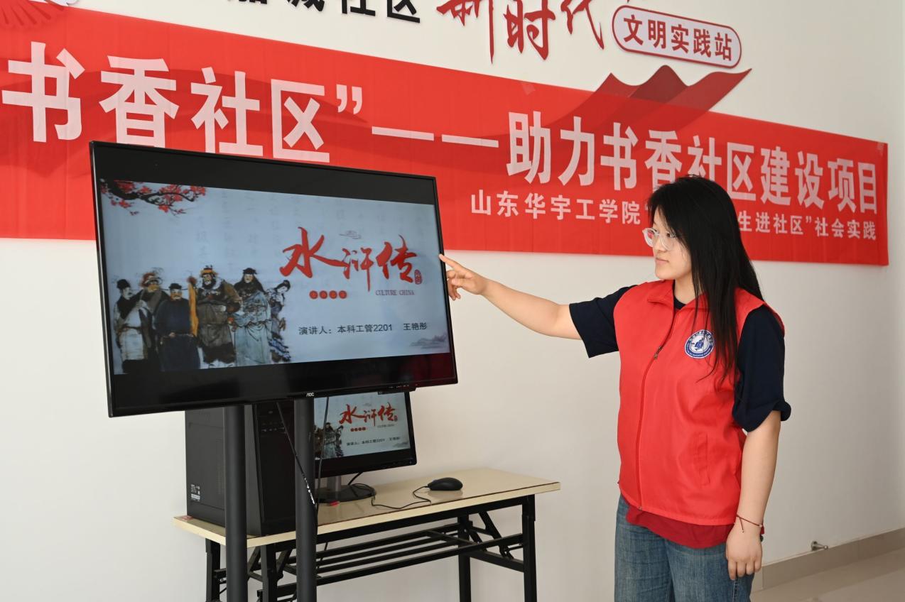 活动期间,志愿者们组织读书分享会,向社区的孩子们分享了《老人与海》|《水浒传》等多个名著作品,通过现场演绎、双方互动使书本上的内容变得形象立体。分享会上欢声笑语,孩子们在积极快乐的氛围中提升了对阅读的兴趣。随后,志愿者与社区居民共同来到社区图书室,居民们自行挑选感兴趣的书籍进行阅读,与志愿者一起分享交流书中的精彩片段,大家从理论谈到实际,从篇章谈到生活,实现了资源共享、互融互通、共同进步。活动最后,志愿者在教室告示板上张贴阅读宣传页,向大家宣传“书香山东”微信公众号,丰富居民日常阅读渠道。
