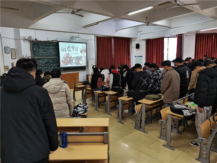 活动中,同学们全体起立默哀一分钟,每位同学都怀着沉重的心情,虔诚的悼念死难同胞,缅怀过去,铭记历史。同学们仿佛在这一分钟再次见证了那一段惨痛悲壮的历史血泪。