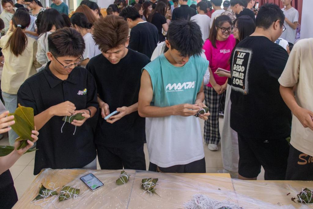 活动现场,欢声笑语不断,在师傅示范讲解完包粽子的步骤和技巧后,同学们纷纷动手尝试。大家围坐在一起,卷粽叶、填糯米、放馅料、裹叶子、扎棉线,虽然手法略显生疏,但热情高涨,现场氛围十分欢乐。在包粽子的过程中,同学们还互相交流、互相学习,分享着自己对于端午节的记忆和感受,感受着传统习俗带来的乐趣。